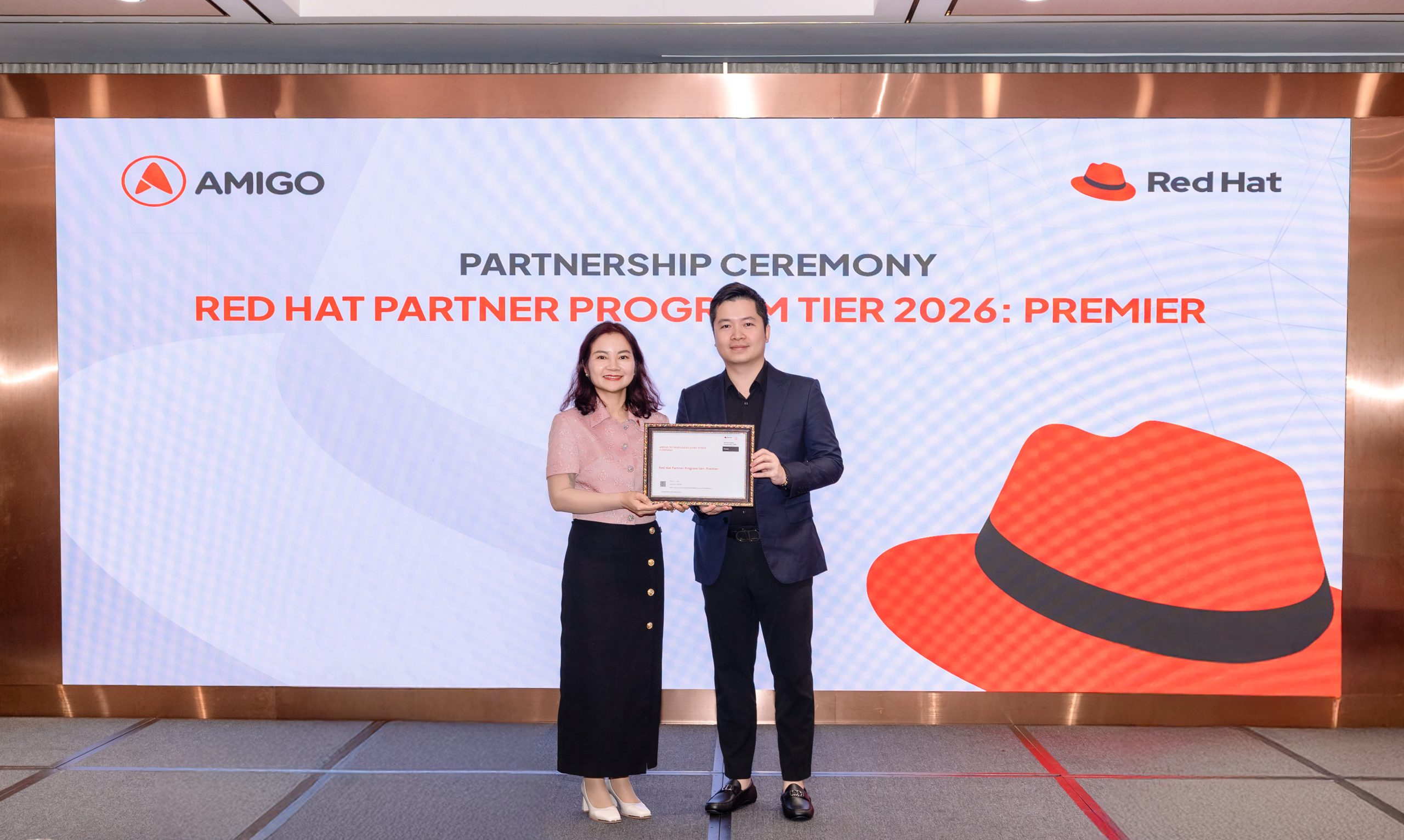 Chứng nhận được trao trong khuôn khổ sự kiện với sự tham dự của đại diện lãnh đạo hai bên. Đây không chỉ là dấu mốc quan trọng trong quan hệ hợp tác giữa Amigo và Red Hat, mà còn ghi nhận những đóng góp của Amigo trong việc phát triển thị trường và triển khai các giải pháp công nghệ dựa trên nền tảng Red Hat tại Việt Nam.