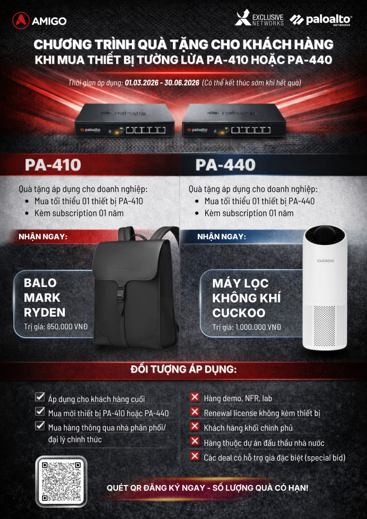 Amigo, Platinum Innovator Partner của Palo Alto Networks cùng Exclusive Networks mang đến chương trình ưu đãi hấp dẫn dành cho khách hàng triển khai mới thiết bị tường lửa PA-410 và PA-440. Doanh nghiệp không chỉ nâng cấp hệ thống bảo mật mà còn nhận thêm nhiều phần quà giá trị.