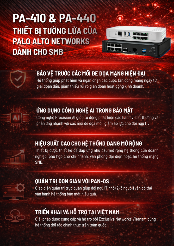 Tự hào là Platinum Innovator Partner của Palo Alto Networks tại Việt Nam, Amigo xin giới thiệu dòng Next-Generation Firewall PA-410 và PA-440, được thiết kế tối ưu cho môi trường doanh nghiệp, đặc biệt với các doanh nghiệp yêu cầu cao về bảo mật, hiệu năng và độ ổn định hệ thống.